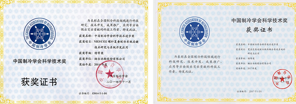 2014年-2017年,NH3/CO2螺桿復(fù)疊制冷技術(shù)與寬溫區(qū)冷熱耦合系統(tǒng)技術(shù)先后榮獲中國制冷學(xué)會科技進(jìn)步特等獎。